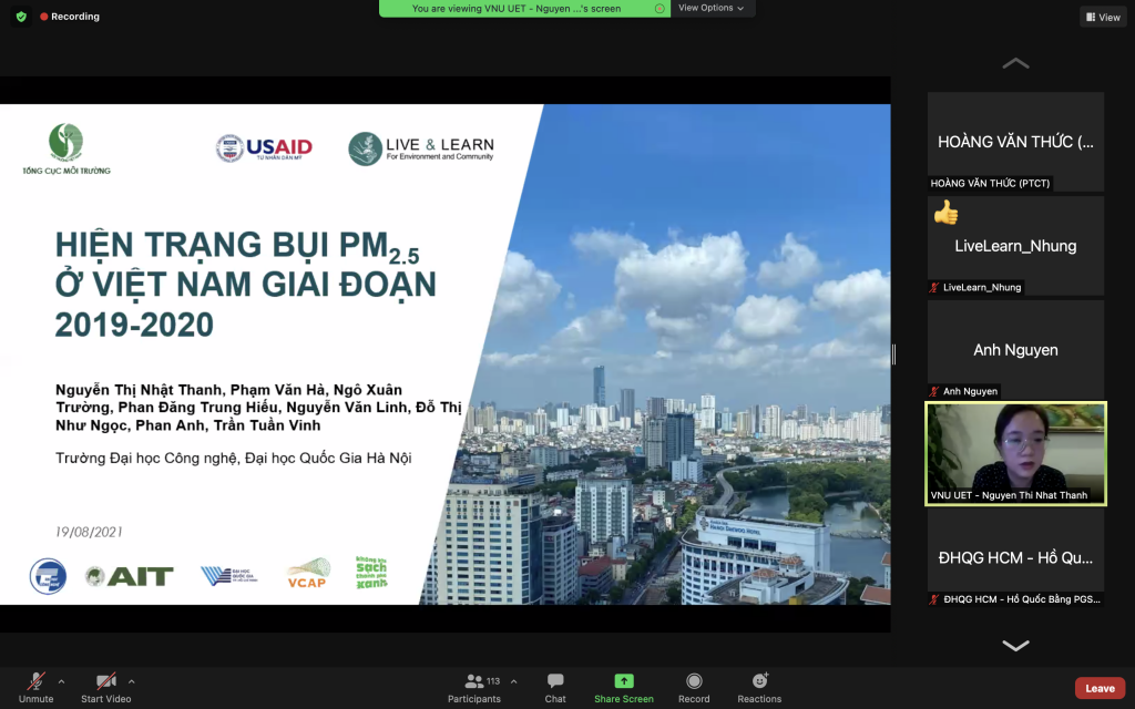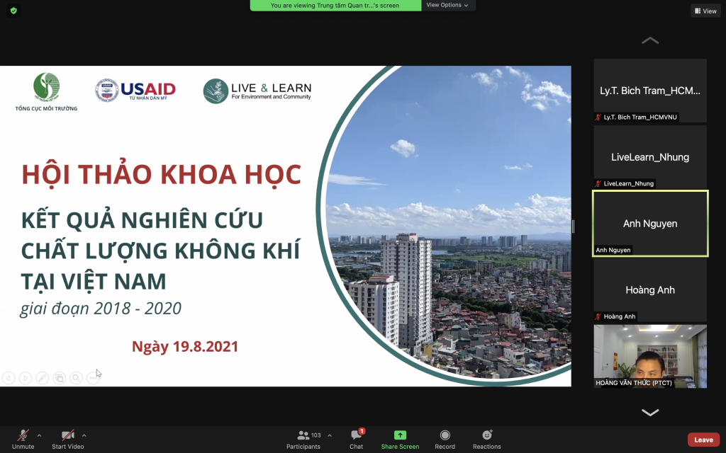 Sáng 19/08/2021, Ngày 19 tháng 8 năm 2021, Tổng cục Môi trường phối hợp với Cơ quan Phát triển quốc tế Hoa Kỳ (USAID) và Trung tâm Sống và Học tập vì Môi trường và Cộng đồng (Live&Learn) tổ chức Hội thảo khoa học trực tuyến chia sẻ và cập nhật các kết quả nghiên cứu về chất lượng không khí tại Việt Nam giai đoạn 2018-2020. Hội thảo đã cập nhật và chia sẻ một số kết quả nghiên cứu về chất lượng không khí tại Việt Nam giai đoạn 2018-2020 trong đó tập trung cho các đô thị lớn là Hà Nội và thành phố Hồ Chí Minh; phương pháp nghiên cứu; thực trạng, nguyên nhân và khuyến nghị chính sách.