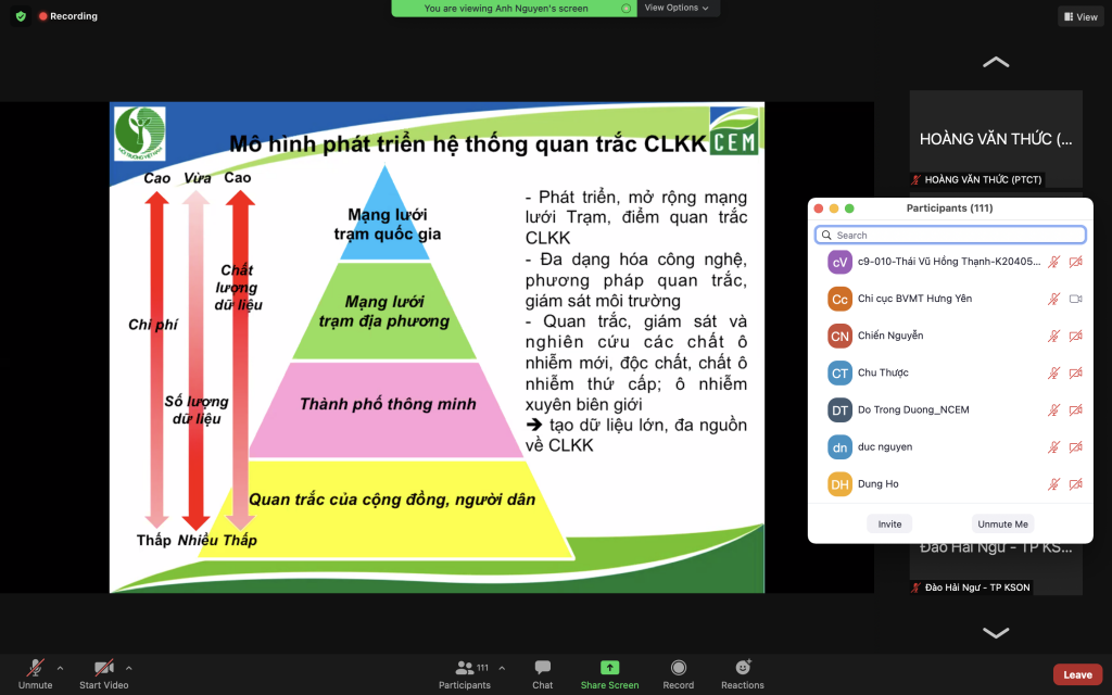 Từ phía Trung tâm Quan trắc Môi trường miền Bắc, Phó giám đốc Trung tâm, Bà Nguyễn Nguyệt Ánh đã có bài trình bày về hiện trạng mạng lưới quan trắc quốc gia và một số đề tài nghiên cứu khoa học mà Tổng cục môi trường và Trung tâm đang thực hiện. Theo đó, từ 2021 đến 2023, Tổng cục sẽ tiến hành kiểm kê phát thải vùng kinh tế trọng điểm phía Bắc và Nam, xác định tỷ lệ đống góp của các nguồn phát thải PM 2.5 . Một dự án cũng sẽ sớm được triển khai là xây dựng và vận hành hệ thống dự báo, cảnh báo CLKK theo thời gian thực và ngắn hạn.