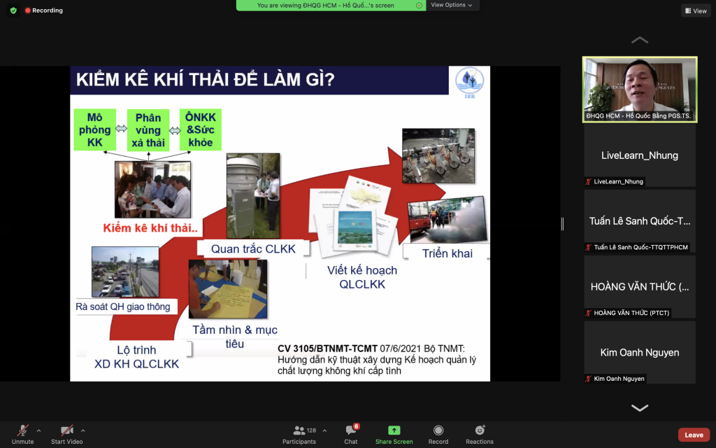 PGS. TS. Hồ Quốc Bằng từ Viện Môi trường và Tài nguyên, ĐH Quốc gia TP.HCM trình bày kết quả xác định nguồn thải ONKK tại TP. HCM, và từ đó chia sẻ phương pháp khoa học để xây dựng kế hoạch quản lý CLKK, từ kiểm kê nguồn thải, tới đánh giá tác động sức khỏe và đưa ra giải pháp. Kết quả kiểm kê năm 2017 cho thấy tổng lượng phát thải bụi PM 2.5 của TP. Hồ Chí Minh năm 2017 là 4,029 nghìn tấn (các nguồn đốt phụ phẩm nông nghiệp, cháy rừng, đốt rác thải chưa được tính đến). Trong đó, cơ cấu đóng góp của các nguồn thải với nguồn đường (giao thông) đóng góp vào phát thải bụi PM 2.5 cao nhất (45%), sau đó đến nguồn công nghiệp (32%), nguồn dân sinh (23%).