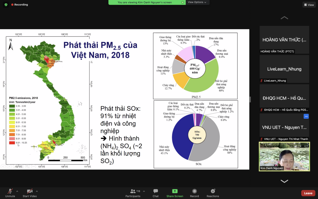 TS. Nguyễn Thị Kim Oanh, Viện Công nghệ châu Á, Thái Lan đã trình bày về phương pháp và kết quả kiểm kê phát thải PM 2.5 năm 2018 tại Việt Nam, đồng thời so sánh kết quả này với các nghiên cứu kiểm kê khác tại Việt Nam. Kết quả kiểm kê cho năm 2018 ước tính 600 nghìn tấn PM 2.5 năm (chưa kể bụi đường) chủ yếu từ đốt phụ phẩm nông nghiệp (40%), theo sau là đun nấu dân dụng (17%), cháy rừng (12.7%), giao thông đường bộ (13%), và hoạt động công nghiệp (11%). Các lĩnh vực còn lại có đóng góp tổng cộng khoảng 6% tổng lượng phát thải bụi PM 2.5 trong cả nước.Tại Hà Nội, ước tính tổng lượng PM 2.5 phát thải khoảng 20 nghìn tấn/năm (chưa kể bụi đường), trong đó khoảng 48.3% lượng PM 2.5 đến từ các hoạt động công nghiệp và làng nghề, 21.3% từ giao thông, 20.2% do đốt phụ phẩm nông nghiệp (rơm rạ) và 6.6% do đun nấu dân dụng và thương mại.