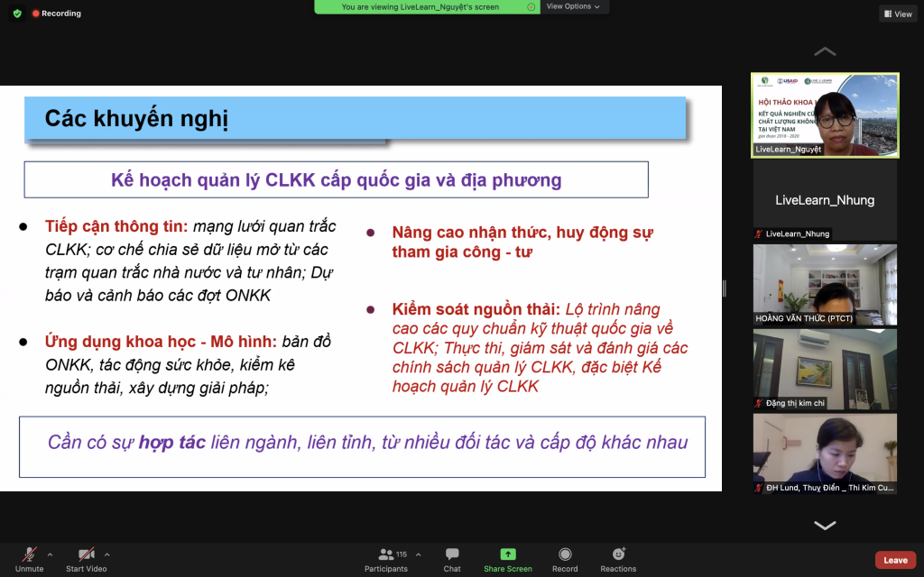 Bà Đỗ Vân Nguyệt, Giám đốc Live&Learn đã trình bày tóm tắt một số các giải pháp và khuyến nghị trong quản lý CLKK, đặc biệt là tại Hà Nội – địa phương đang có nhiều kết quả nghiên cứu về ONKK và cơ sở để triển khai lập kế hoạch quản lý CLKK. Theo bà, việc xây dựng kế hoạch quản lý CLKK cấp quốc gia và địa phương rất cần sự hợp tác liên ngành, liên tỉnh, giữa các cơ quan quản lý và các nhà khoa học. Đồng thời, các cơ quan quản lý cần tham khảo kế hoạch quản lý CLKK của một số quốc gia láng giềng như Thái Lan, Trung Quốc.